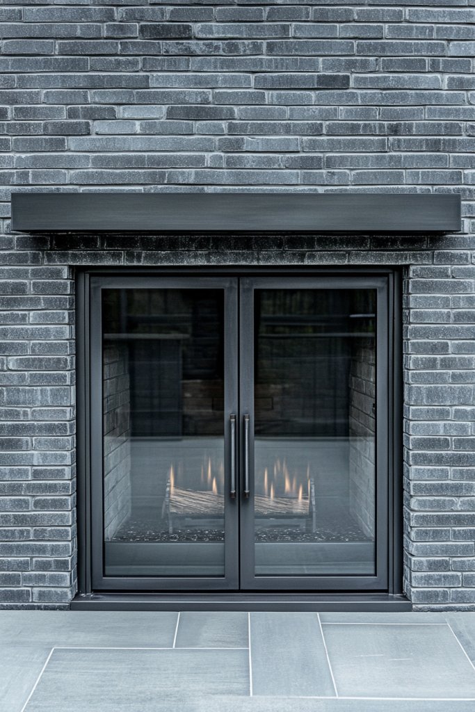Looking for a contemporary fireplace that combines industrial chic with safety? A gray brick surround framed with metal and a glass door creates a sleek, modern look while containing the fire securely. It’s perfect for open-concept spaces or rooms where style and function go hand in hand.