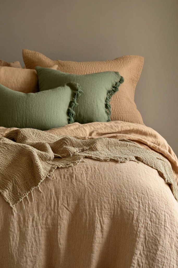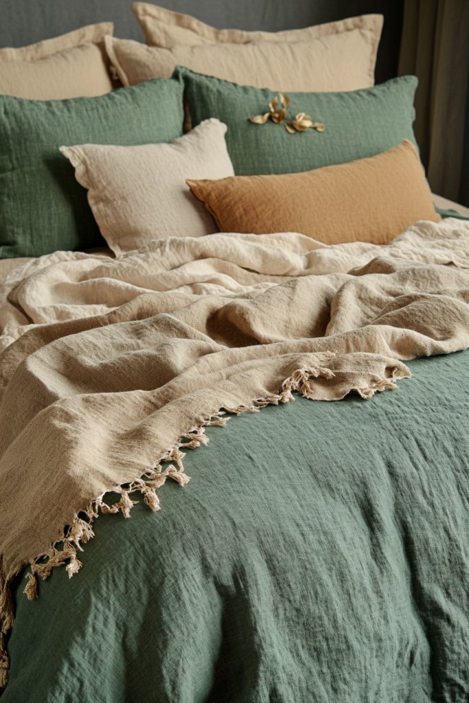 Imagine a bed dressed in crisp linen sheets in a warm tan, layered with a textured green duvet or quilt. Add decorative pillows with woven or embroidered details in matching shades. The soft, natural fabrics and earthy tones make your bed look inviting and serene. Natural light enhances the tactile richness of the textiles.