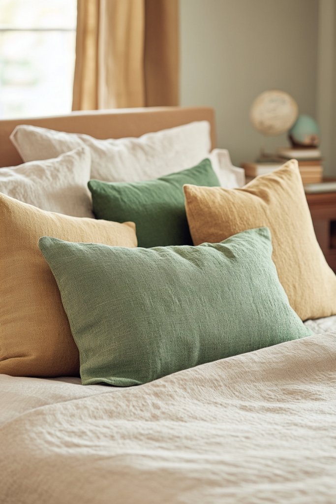 10. Styling with Green and Tan Throw Pillows on Neutral Bedding