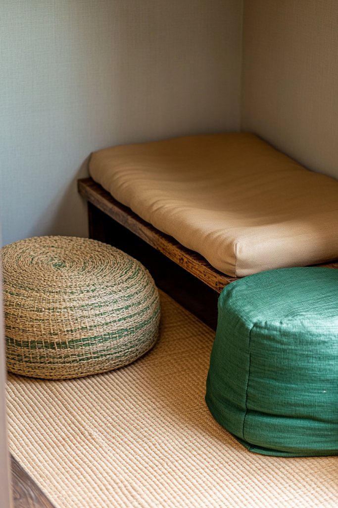 Imagine a corner with a plush tan floor cushion or a low bench topped with soft cushions. A vibrant green pouf provides extra seating or a footrest. Nearby, a small side table holds your favorite mug or a stack of books. Soft ambient lighting enhances the inviting, tranquil vibe, making it perfect for curling up and reading.