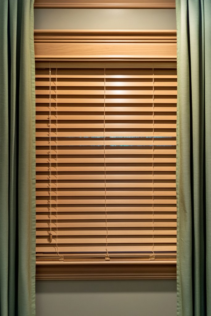 Picture warm-toned wooden blinds in a rich tan finish, paired with flowing green curtains or roller shades in a subtle, leafy pattern. When open, they let in soft daylight, casting a gentle glow. When closed, they block out light for restful sleep. The combination creates a layered, sophisticated aesthetic that complements earthy decor.