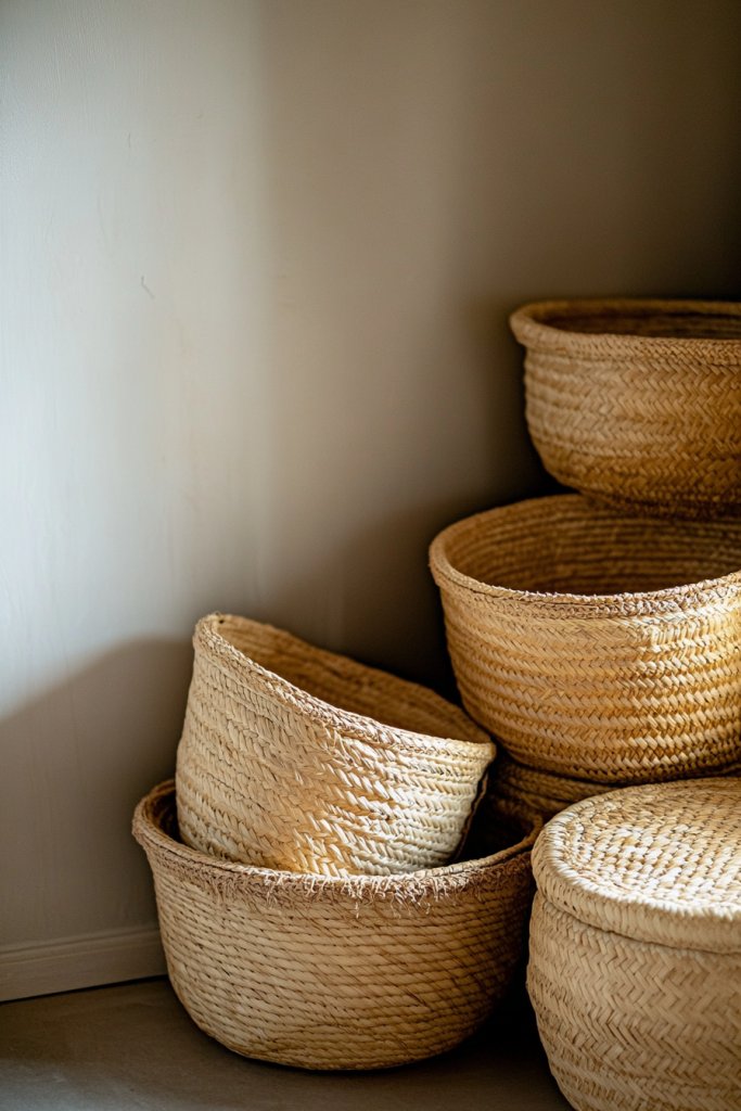14. Using Tan Woven Baskets for Storage and Decor