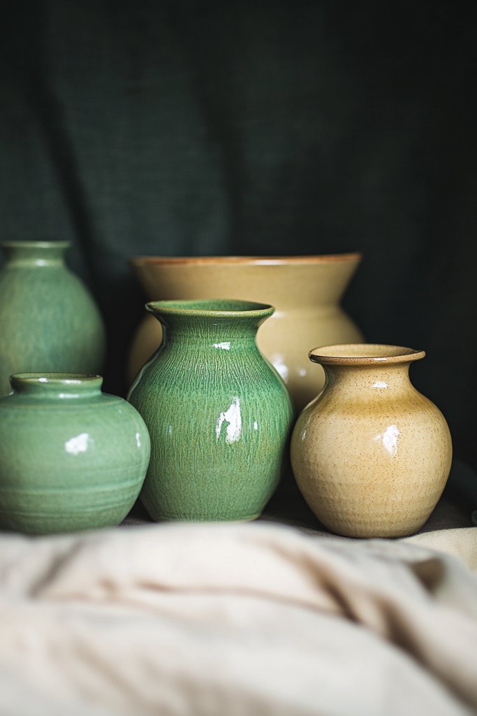 16. Adding Green and Tan Decorative Vases and Ceramic Pieces