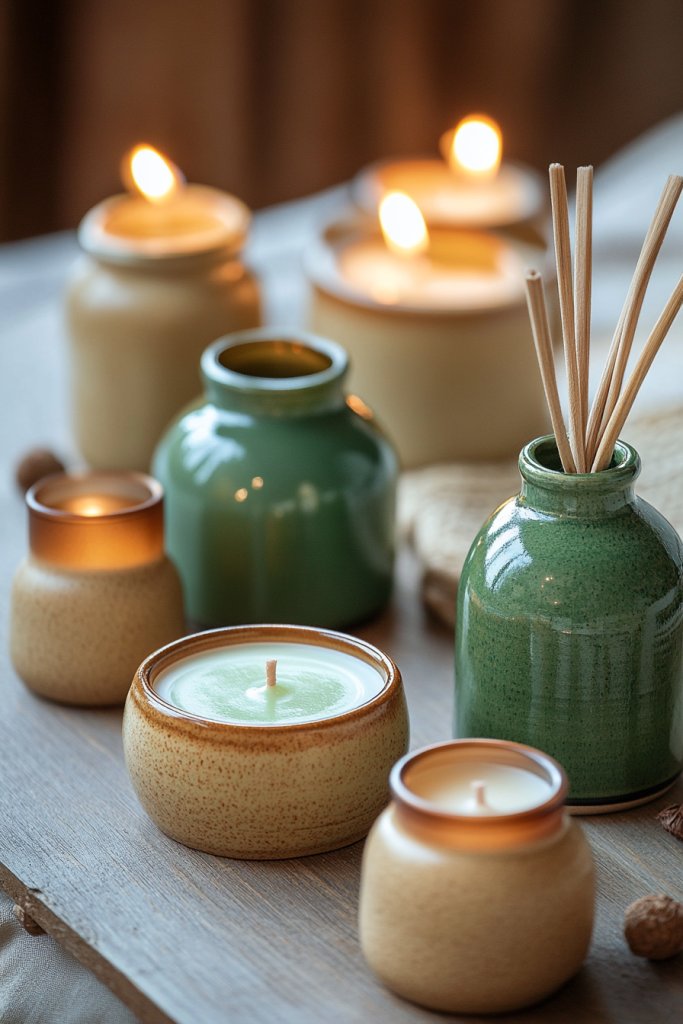 Choose diffusers with minimalist designs or intricate ceramic holders, depending on your style. Select scented candles with natural fragrances like lavender, eucalyptus, or cedarwood. Use decorative trays or coasters in tan or green tones to organize them. Seasonal scents can refresh the atmosphere throughout the year.