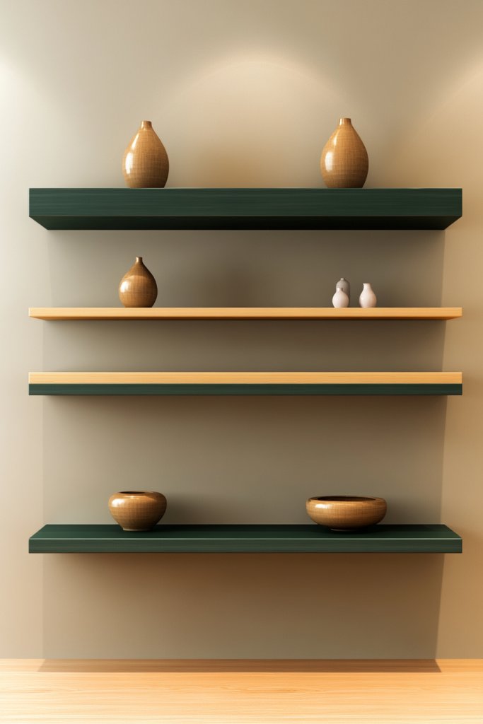 Visualize sleek, floating shelves in natural wood or painted in tan, mounted against a soft green wall. They hold a curated collection of decorative objects, books, or small personal items. The open design keeps the space airy and organized, preventing clutter from taking over. Soft lighting above enhances the minimalist look.