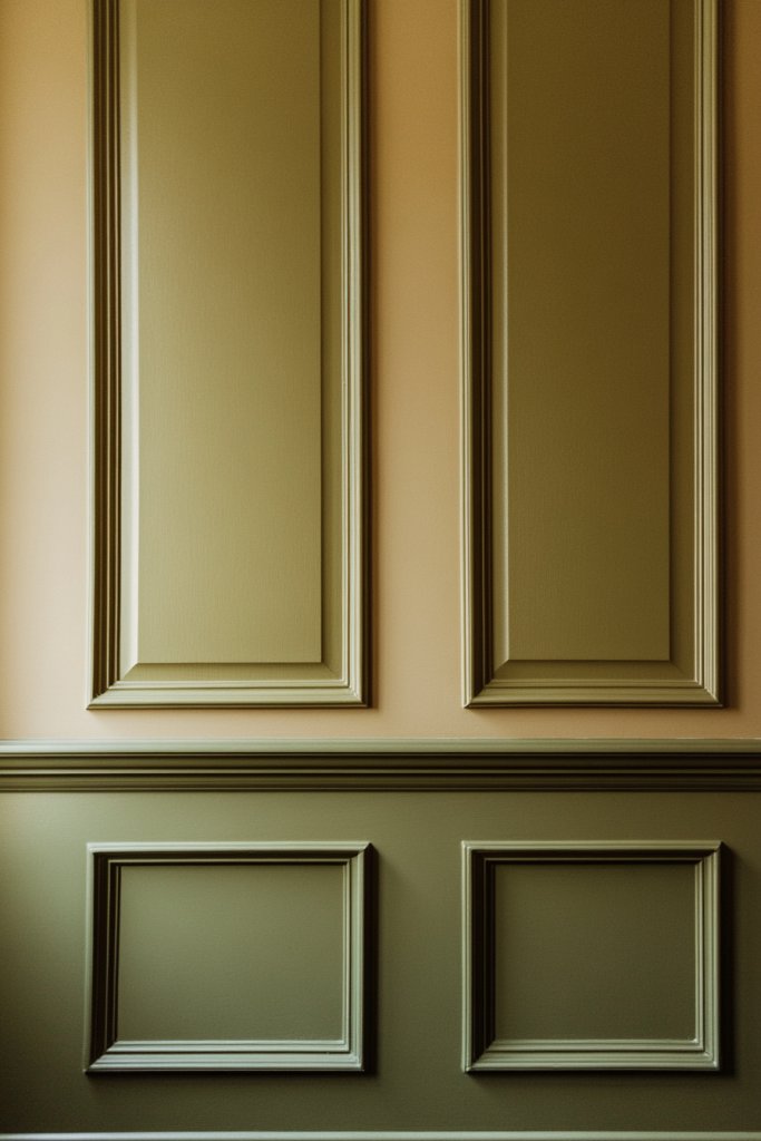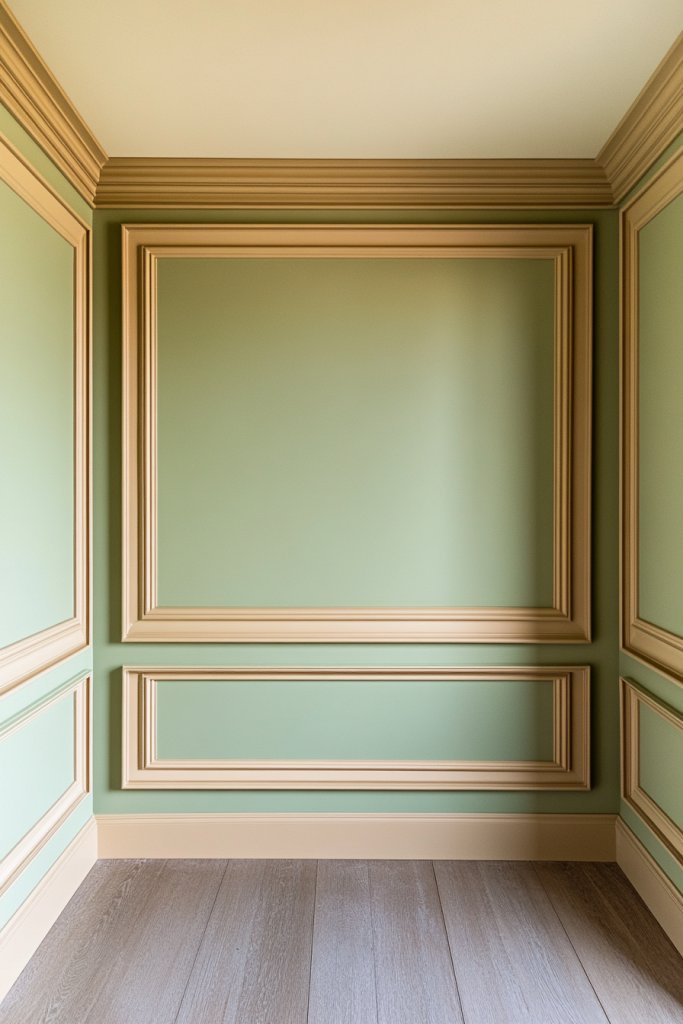 Picture a wall painted in a soft, muted green, with crisp tan molding outlining its edges. The rest of the room features neutral bedding and furniture that lets the accent wall shine. The contrast between the green and tan adds visual interest and a sense of structure. Soft lighting highlights the wall’s texture and color, creating a focal point that draws the eye.