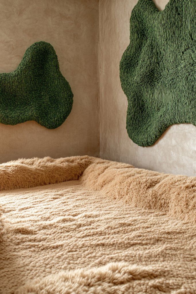 Visualize a soft, beige or caramel-colored rug extending across your floor, adding warmth underfoot. Above, a green textured wall hanging, maybe made of woven fibers or fabric, creates visual depth and a focal point. The combination of the plush rug and tactile art invites you to sink in and relax. Natural light dances across the textures, enhancing the earthy palette.