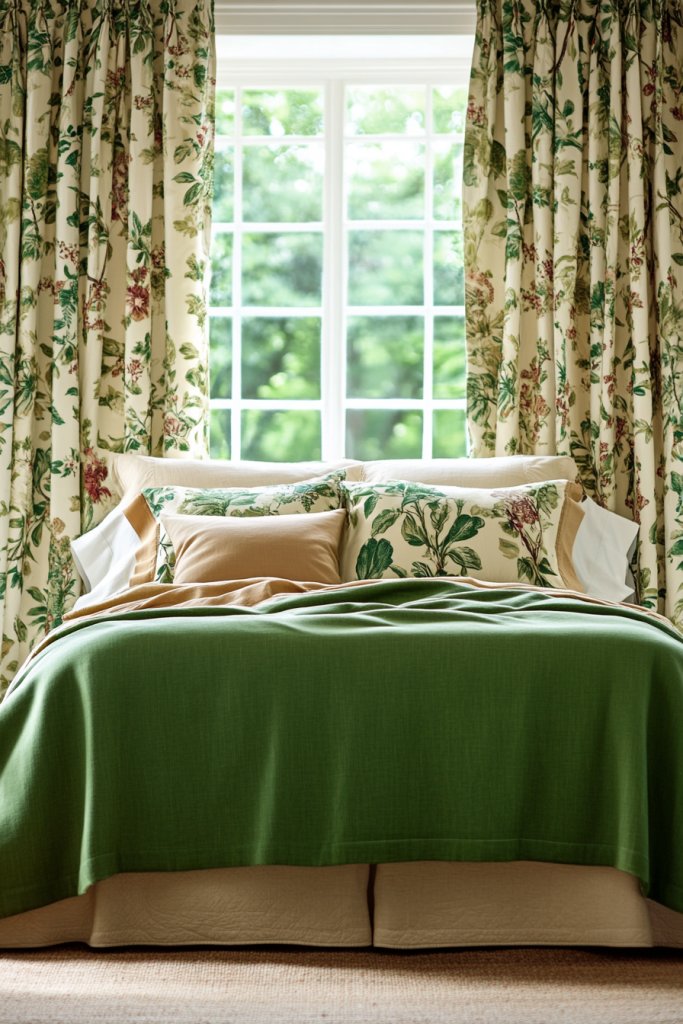 Ever wish your bedroom could feel more like a lush garden retreat? Green and tan linens paired with botanical-print curtains bring the outdoors inside, creating a fresh, vibrant atmosphere. This combo enhances your space with color and life, making every morning feel like a breath of fresh air. Who doesn’t want a bedroom that feels like a personal oasis?
