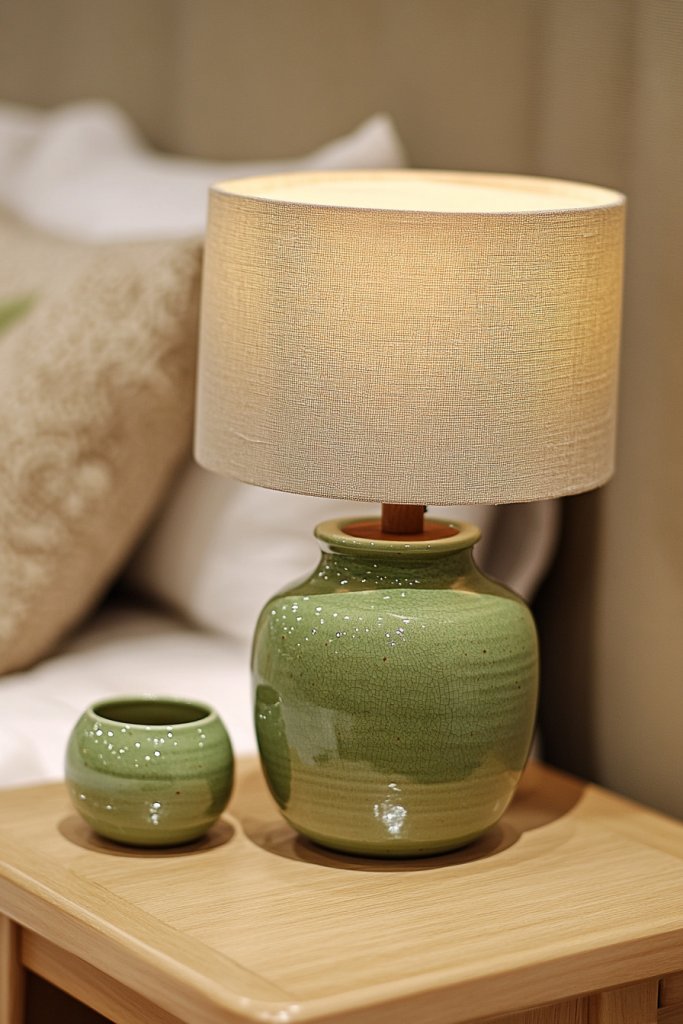 Select a sturdy tan bedside table that fits your space and style. Pick a green ceramic lamp that’s proportionate to the table and bed. Place the table close to your bed for easy access. Arrange bedding in complementary tones, and add small decorative elements like textured throws or cushions. Keep the setup clutter-free for a clean, polished look.