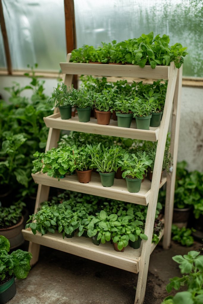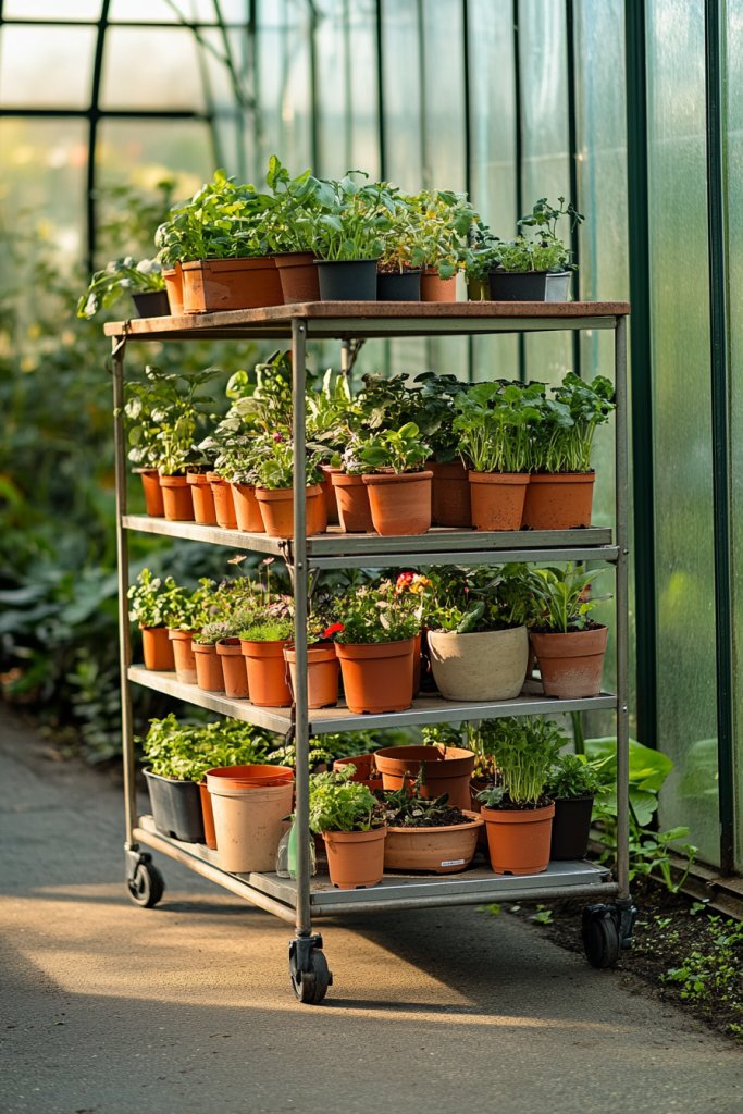 Imagine sleek, multi-level shelves made from reclaimed wood or metal, stacked vertically against a sunny wall. Herbs flourish on different tiers, their fragrant leaves catching the light. Small potted veggies like cherry tomatoes or radishes sit neatly on each level, making the most of limited space. The textured wood or smooth metal adds a modern yet rustic vibe, turning clutter into organized charm. It’s like a mini urban farm right in your own greenhouse corner.