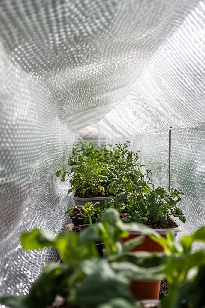 Visualize rolls of reflective bubble wrap lining the interior walls, trapping heat during winter or blocking excessive sunlight in summer. Shade cloths drape over vents or windows, diffusing harsh rays while still allowing light penetration. The textured bubble wrap creates a cozy, quilted appearance, while the shade cloth adds a soft, fabric layer. Together, they create a controlled, comfortable climate inside your greenhouse.