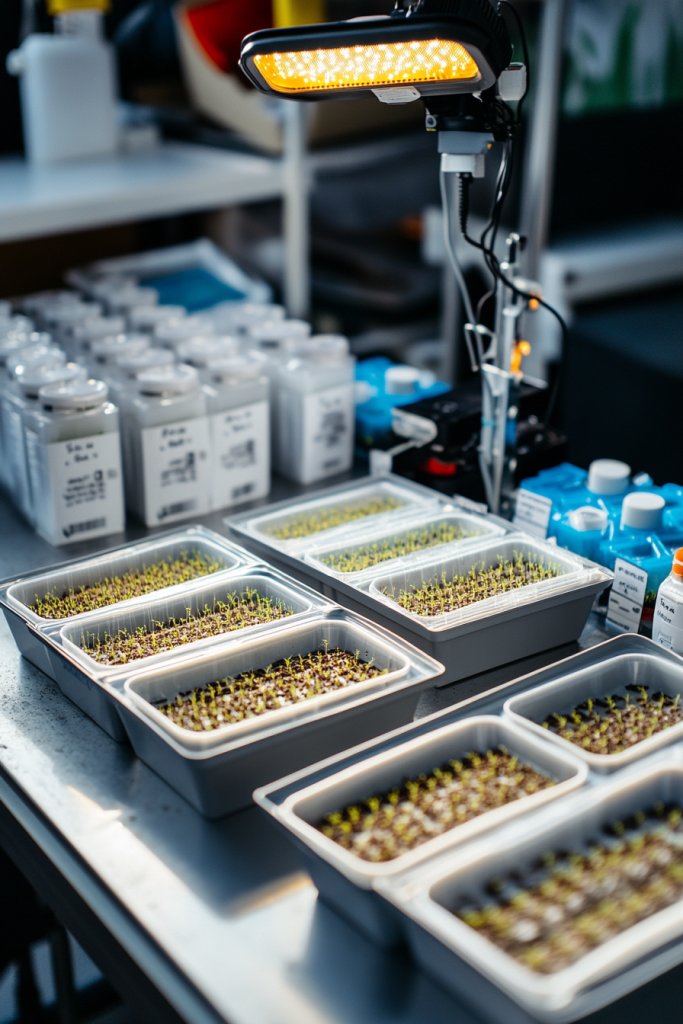 Picture a small, organized corner with a multi-tiered shelf or table holding seed trays, heat mats, and grow lights. The trays are filled with moist soil and tiny sprouts pushing through, eager for warmth and light. Bright LED grow lights hang overhead, mimicking sunlight, while a small fan circulates fresh air. Labels mark each variety, and clear plastic covers create a mini greenhouse effect, keeping humidity high. It’s a cozy, efficient space that nurtures life from the very beginning.