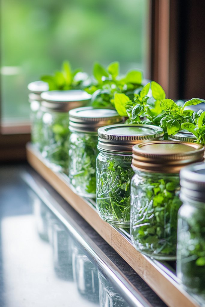 Imagine a wooden or metal board mounted on the wall, with jars suspended from hooks or brackets. Each jar is filled with soil and sprouting herbs—basil, mint, parsley, or thyme—vibrant and lush. The transparent glass showcases roots and soil, adding an organic feel. Greenery spills over the edges, creating a lively, textured display. It’s a functional art piece that combines beauty and practicality.