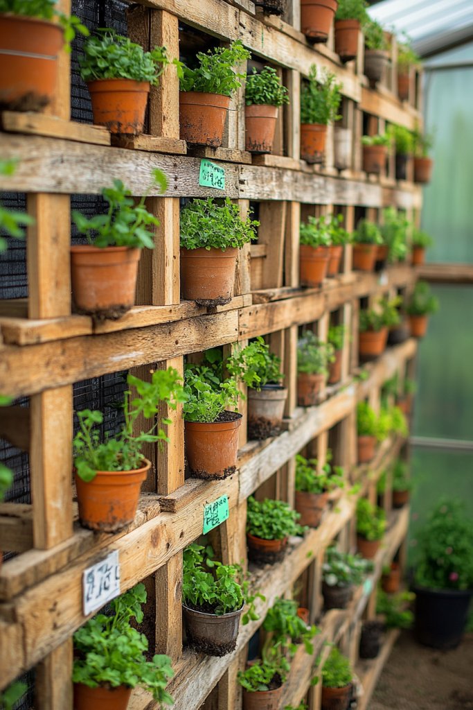 Imagine a sturdy wooden pallet mounted on your greenhouse wall, filled with small pots or directly planted with herbs, lettuces, or succulents. The rough, rustic texture of the pallet provides a charming backdrop for a vibrant array of greenery. Pockets or containers are attached securely, allowing for easy planting and maintenance. The design creates a layered, textured visual that adds character and life to your space. Light filters through the gaps, enhancing airflow and creating a dynamic environment.