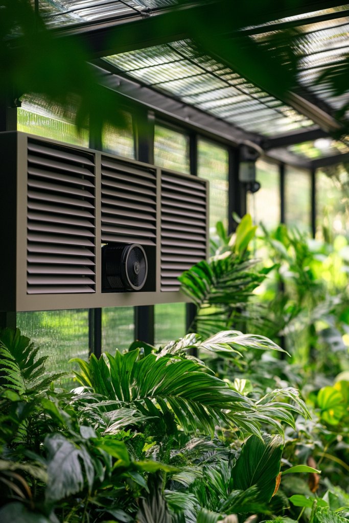 Envision adjustable vents installed on roof and side panels that open and close automatically based on temperature. Small exhaust fans or ridge vents work in tandem to expel hot, humid air, drawing in fresh air from outside. Sensors monitor temperature and humidity, triggering the system as needed. The airflow creates a gentle breeze, cooling or heating your plants naturally. The setup looks sleek, almost like a smart, breathing organism.
