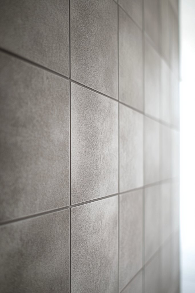 Imagine walking into a spacious bathroom where large, matte grey tiles cover the entire wall, creating a seamless, calming environment. The textured surface absorbs light softly, reducing glare and adding depth. The subtle variation in shades makes the space feel layered but cohesive. The tactile feel of the matte finish invites you to touch and relax in this modern sanctuary.