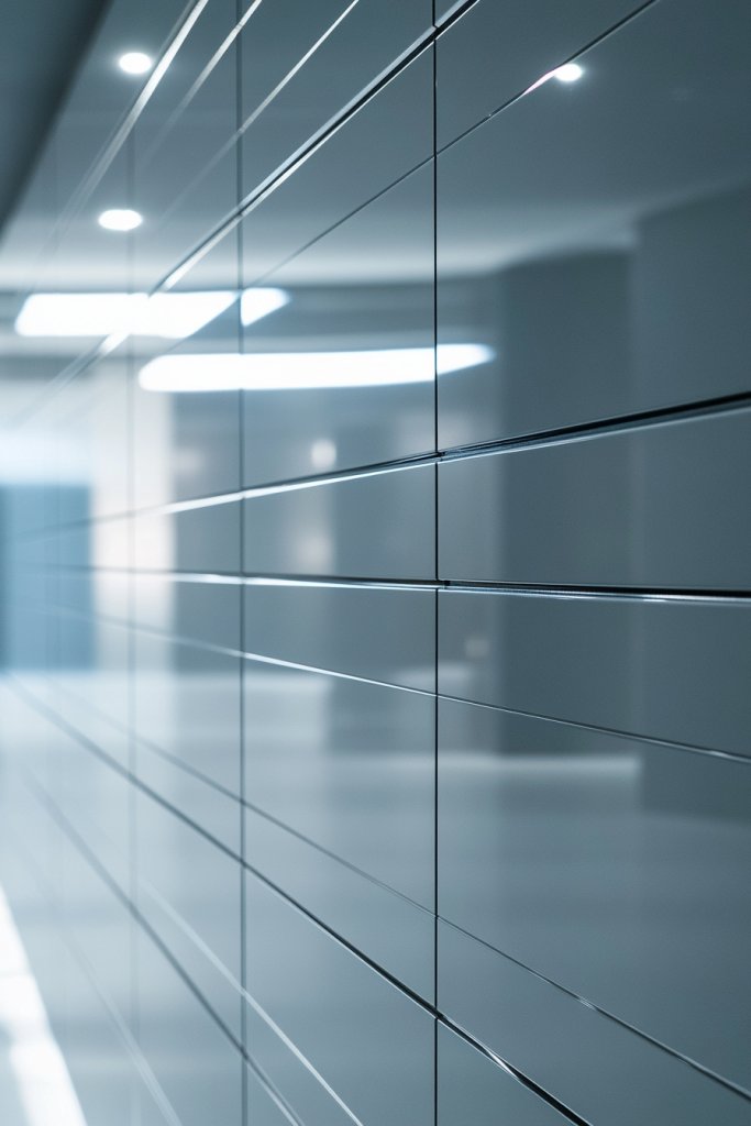 Imagine smooth, glossy grey panels running from floor to ceiling, creating a sleek, uniform surface. The reflective quality adds depth, bouncing light around the room and highlighting architectural details. They contrast nicely with matte fixtures and textured textiles, balancing shine with subtlety. The panels’ clean lines create a contemporary aesthetic that’s both elegant and functional.