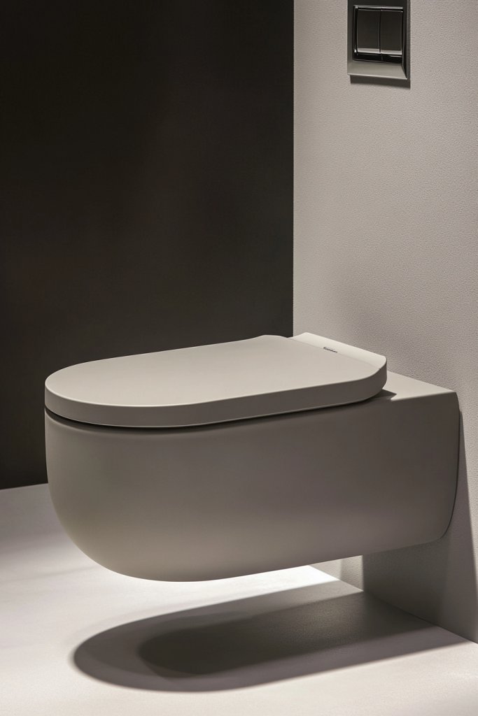 Picture a streamlined, wall-mounted toilet with a smooth, matte grey surface floating effortlessly against a neutral wall. The concealed cistern hides behind the wall, creating a clean, uncluttered look. The soft hue complements various wall colors and fixtures, making the entire space feel cohesive and open. The minimalist design emphasizes simplicity and functionality.