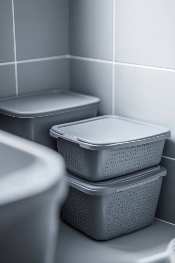 Visualize a set of sleek, grey baskets in different sizes neatly stacked or tucked into a corner. Their matte or textured finish complements tiles and fixtures, creating a cohesive look. The neutral tone blends into the background, allowing decorative elements to stand out. Their simple design makes them perfect for storing towels, toiletries, or laundry without clutter.
