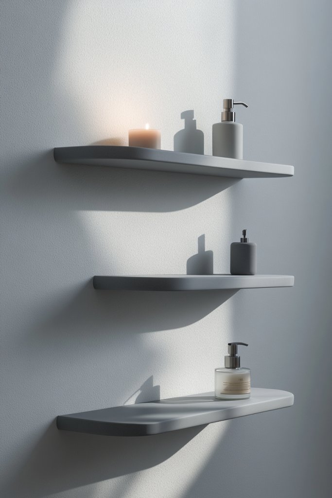 Visualize sleek, wall-mounted floating shelves in a gentle grey color, running along a clean wall. They appear to hover effortlessly, thanks to hidden brackets, creating a minimalist vibe. The soft hue complements a variety of tile and fixture colors, blending seamlessly into the overall design. Small decorative containers or baskets on the shelves add texture and keep items organized.