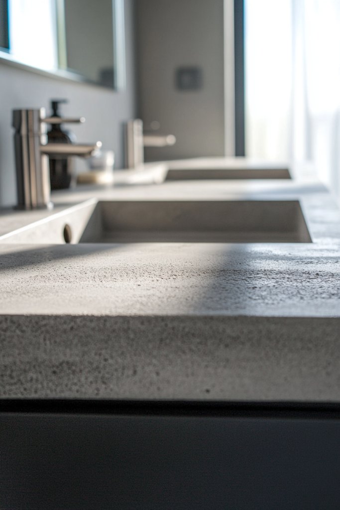 Start with high-quality concrete-inspired laminate or epoxy resin surfaces designed for wet environments. Professional installation ensures a smooth, durable finish. If opting for real concrete, hire experienced craftsmen to pour and cure the material properly. Seal the surface with a stain- and water-resistant sealant to prevent staining and damage. Pair the countertop with minimalistic fixtures and open shelving for a complete industrial look.