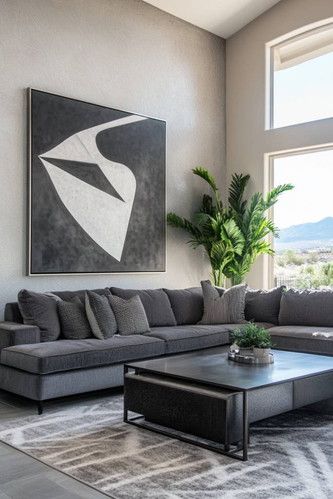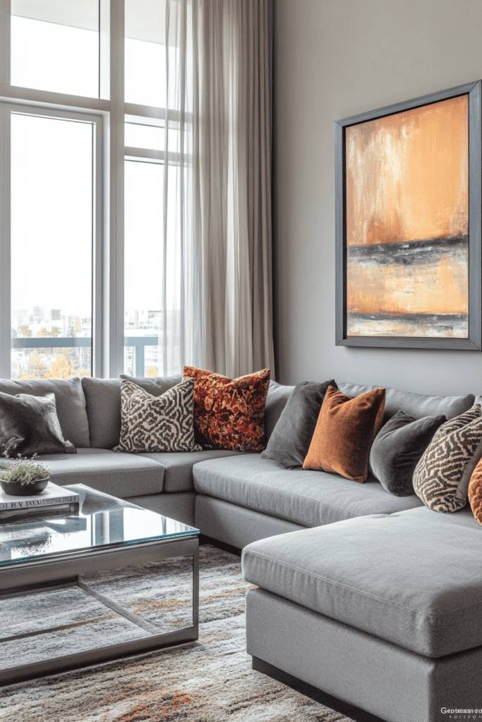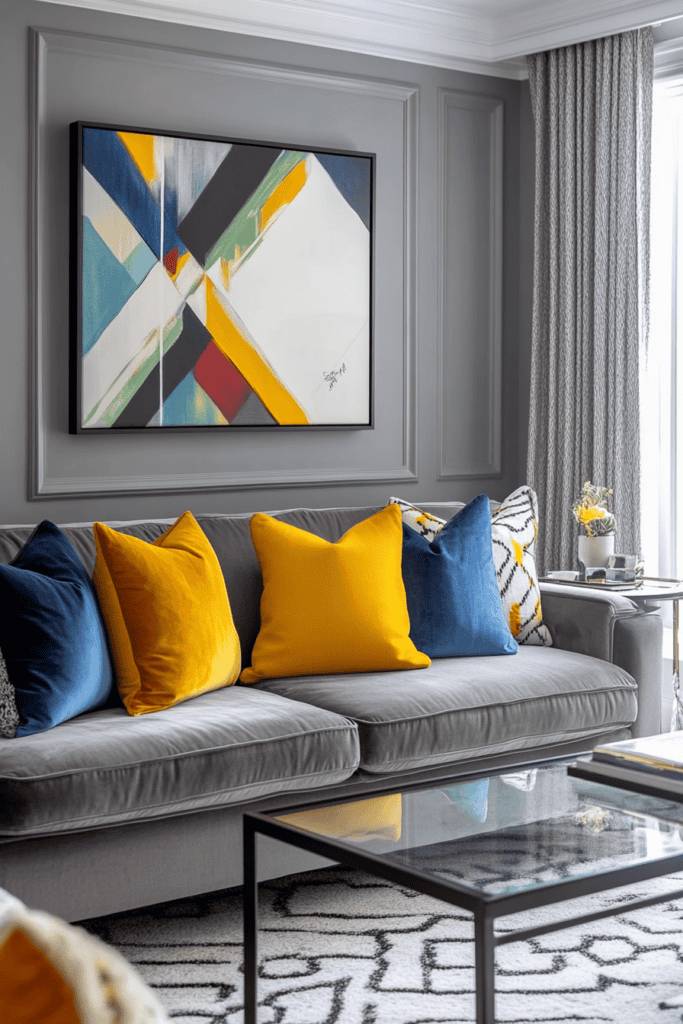 Wall art can also play a significant role; a large canvas with abstract designs in bright colors will draw the eye and create a focal point. When it comes to furnishings, opt for a bold-patterned accent chair that contrasts beautifully with your grey sofa.
