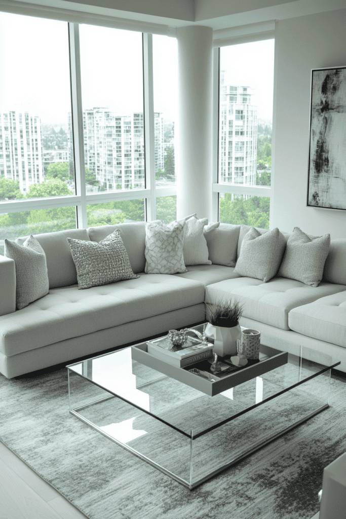 Incorporate light-colored furniture—think white or pale wood—to maintain that airy feel. A plush grey sofa can be complemented with light throw pillows for contrast without overwhelming the space.