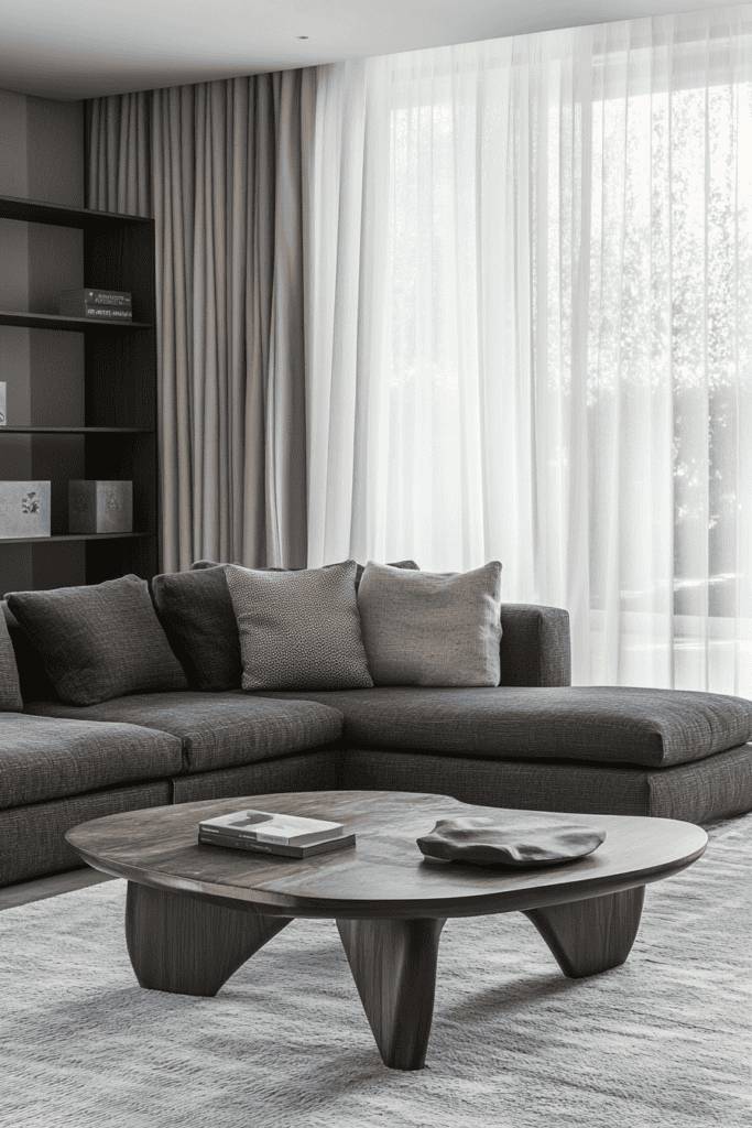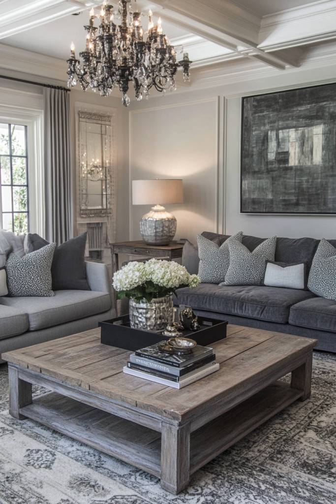 Embracing a sophisticated grey palette can elevate your living room into a domain of understated elegance, especially when paired with natural wood accents. Think about using a cool, charcoal grey for your walls, which can create a striking backdrop for lighter wood elements. Consider incorporating a reclaimed wood coffee table or warm oak shelves; these pieces add warmth and texture, balancing the sleekness of grey.