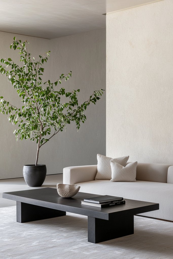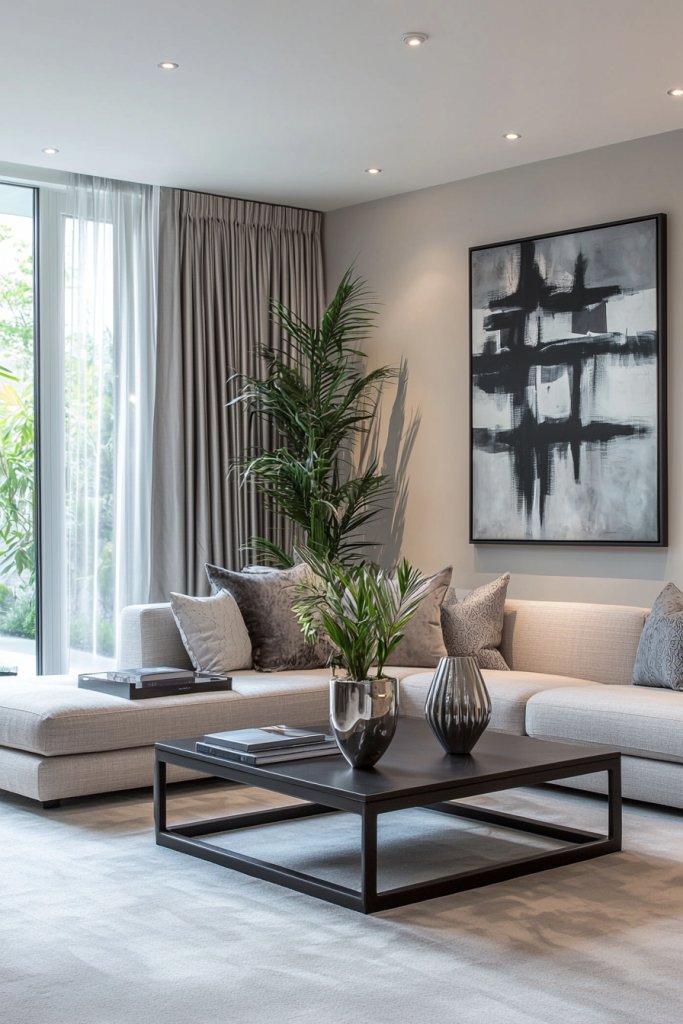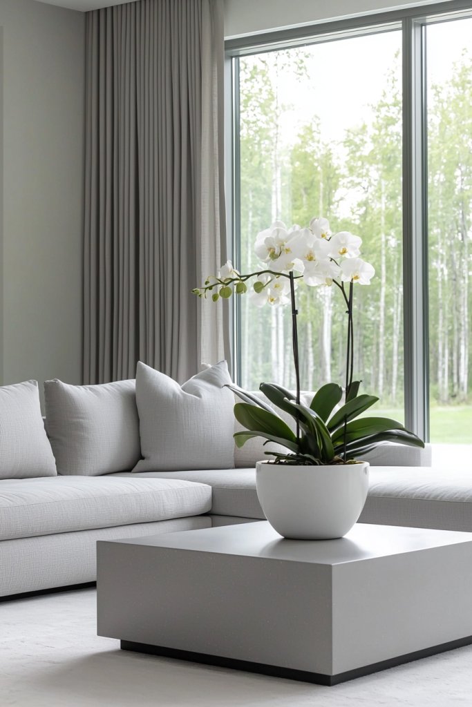 Or imagine a tall snake plant standing proudly in a minimalist pot, its upright form contrasting beautifully with the gentle curves of your sofa. Incorporating various shades of green not only enlivens the space but also offers a rejuvenating contrast to the monochrome palette.
