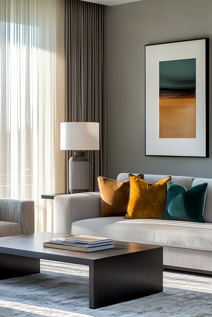 After enhancing your living room with textured grey wall panels, adding colorful throw pillows can infuse the space with personality and vibrancy. Imagine a vibrant mustard yellow pillow nestled against a deep charcoal sofa, creating a striking contrast that draws the eye.