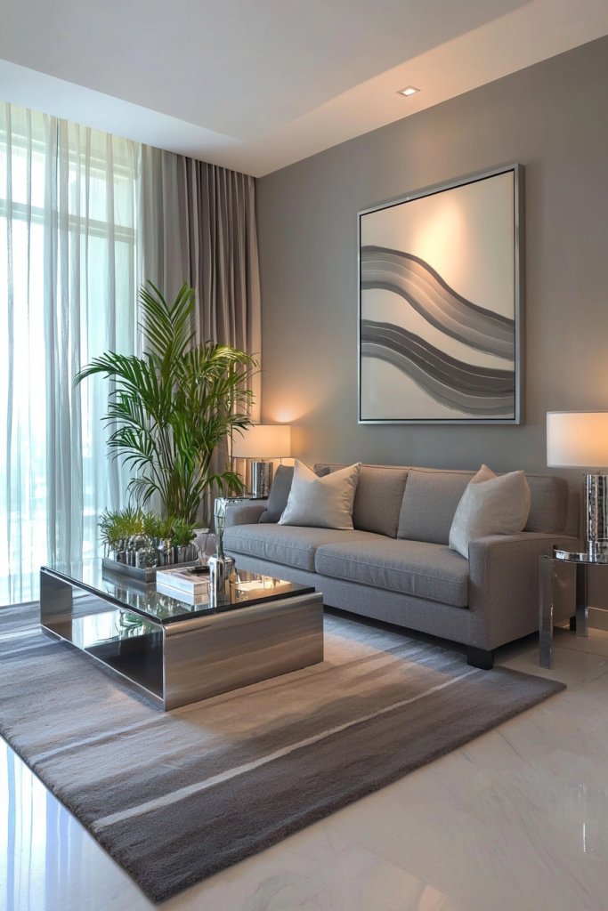 Pairing grey hues with metallic accents can elevate your living room into a domain of modern sophistication. Imagine a soft, dove-grey sofa adorned with shimmering silver or gold cushions that catch the light just right, creating a luxurious focal point.