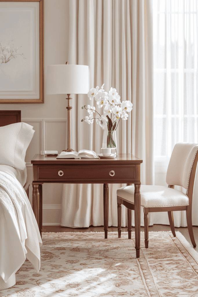 Finally, consider a beautiful desk lamp that not only illuminates your workspace but also serves as a statement piece. This elegant desk space will inspire creativity and productivity, all while seamlessly blending into your sophisticated bedroom environment.