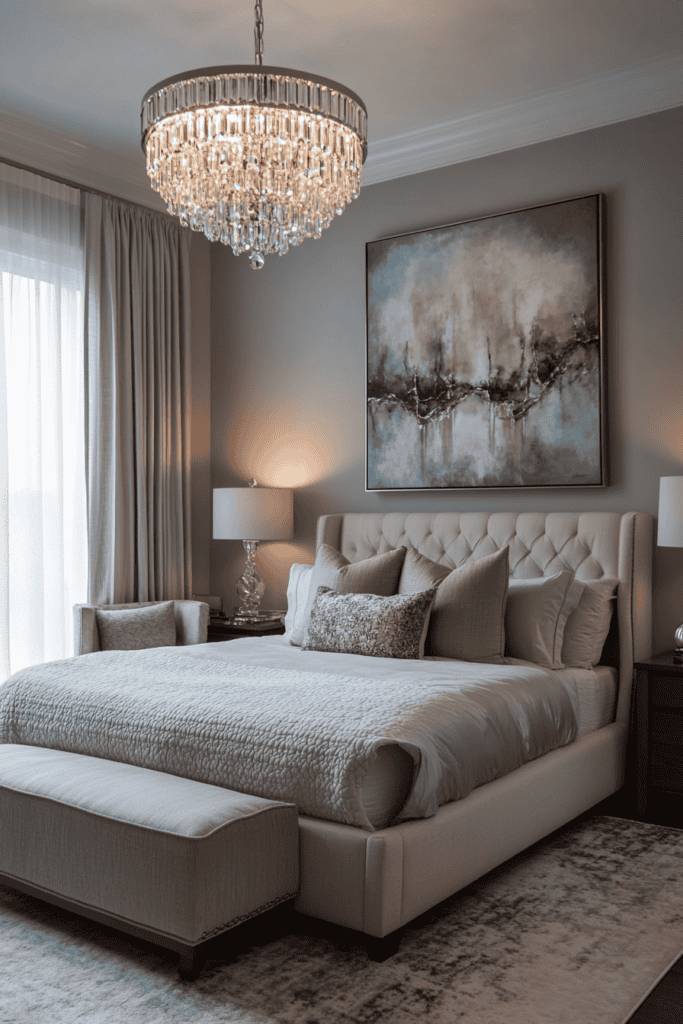 When it comes to designing your grown woman bedroom, lighting can make all the difference, especially with statement fixtures that draw the eye and elevate the space. Consider a bold chandelier that hangs elegantly over your bed, casting a warm glow while adding a touch of glamour. Alternatively, oversized pendant lights can create a modern vibe, perfect for showcasing your unique style.