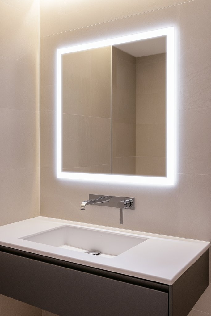 Personalize by choosing lighting color temperatures or adding a few decorative elements around the mirror. Incorporate a small shelf or tray integrated into the mirror’s frame for everyday essentials. Keep the look sleek and clutter-free to maintain the modern vibe.