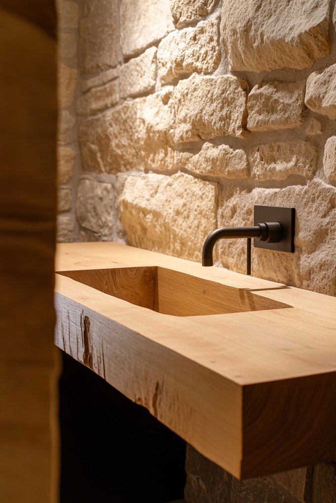 Want to bring warmth and texture to your half bath without adding green plants? Natural elements like wood, stone, or ceramic can create a calming, organic vibe that’s stylish and minimalist. They add tactile interest and a sense of tranquility to the space.