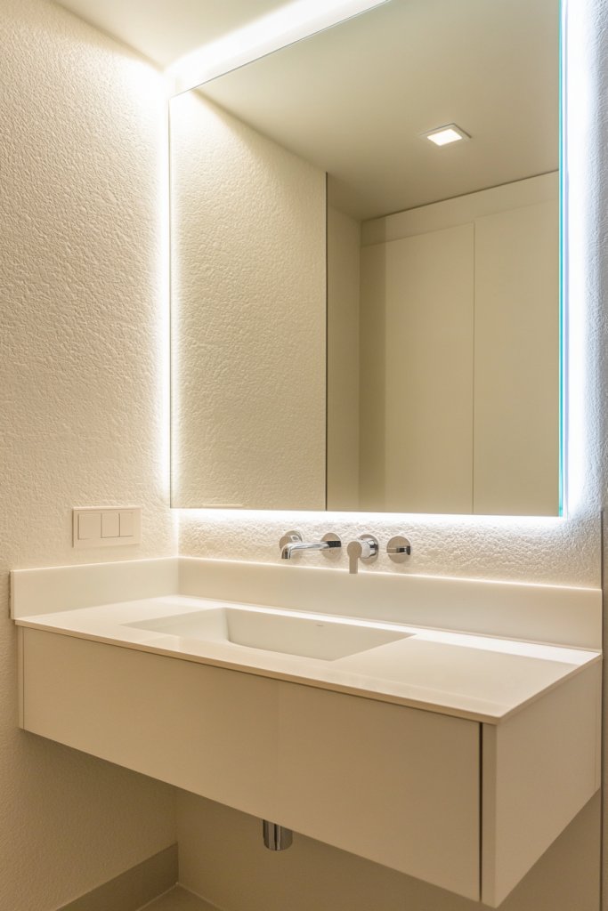Imagine a vast, edge-to-edge mirror mounted flush against the wall, reflecting light and doubling your visual space. The lack of a bulky frame creates a sleek, seamless appearance that enhances minimalist decor. Soft ambient lighting bounces off the mirror, adding warmth and brightness. The result is a bathroom that feels larger and more inviting.