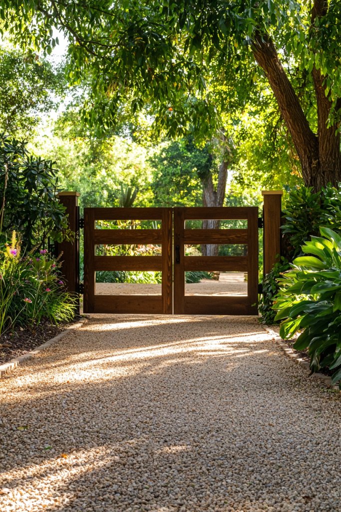 - Rustic wooden gates add warmth and character, inviting guests with their unique grain patterns and classic designs.