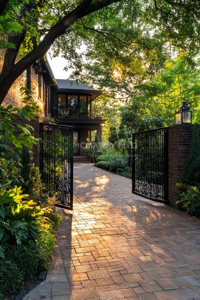 While rustic wooden gates bring a cozy charm to your entrance, elegant wrought iron gates offer a striking contrast that embodies sophistication and strength. These gates are not just functional barriers; they serve as a bold statement piece that elevates your home’s curb appeal.