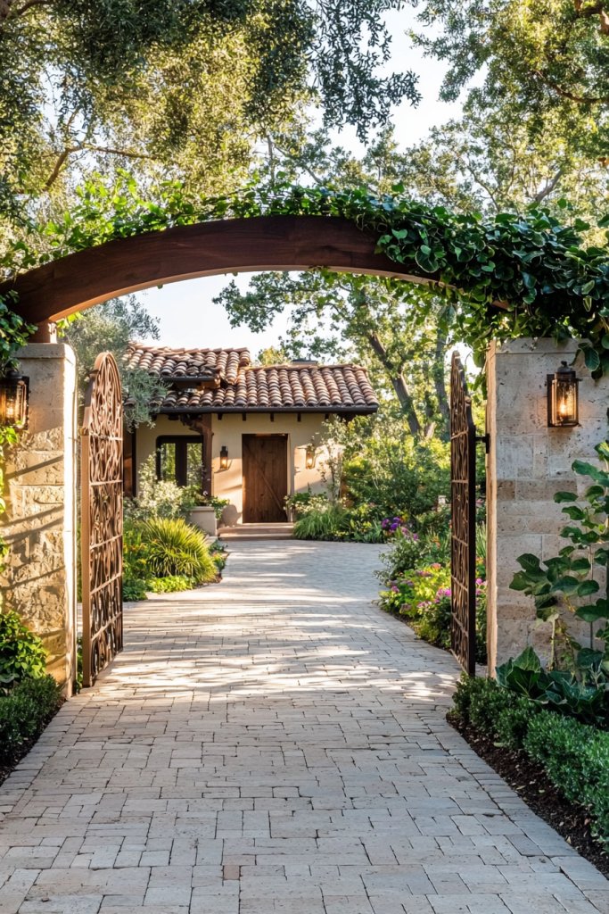 Think about a sturdy gate framed by climbing vines or fragrant blossoms, providing both privacy and charm. Adding decorative accents like lanterns or ornate hardware can further enhance the Mediterranean vibe, giving your entrance a touch of sophistication. With these design elements, your front gate will not only serve as an entryway but also as a stunning statement piece that captures the essence of timeless elegance.
