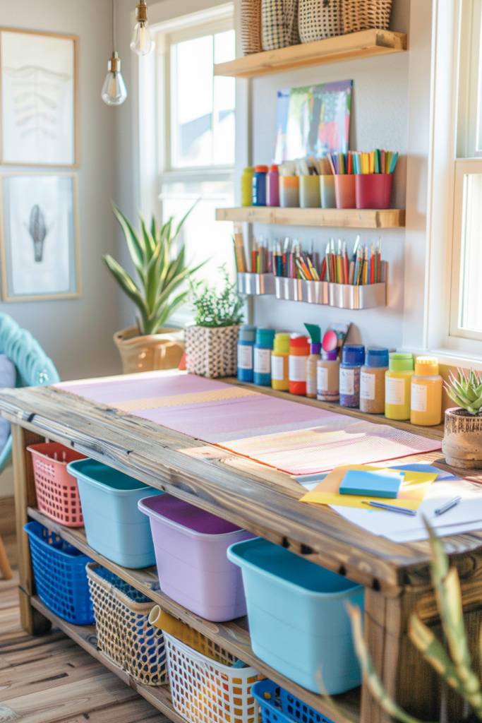 Next, fill the bins with supplies such as yarn, paint, or scrapbook materials, labeling them for easy reference. You might even want to paint the unit in a lively color or add decorative contact paper to give it a personalized touch.