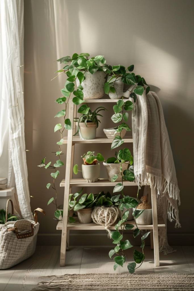 Next, consider adding decorative elements like fairy lights or a string of beads around the legs for an enchanting touch. You can also use the shelves creatively—mixing plants with books or decorative boxes to create visual interest.