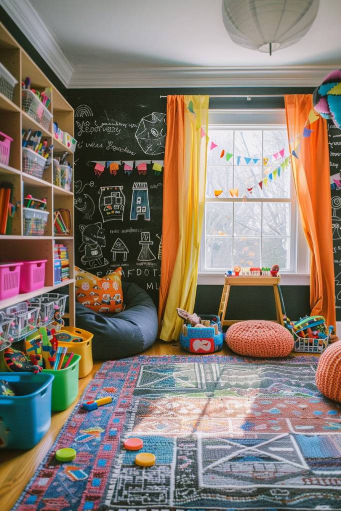 To enhance the experience, pair the chalkboard surfaces with colorful chalk and erasers, making cleanup a breeze. You can even create designated areas for different activities, like a drawing nook or a game zone. Add some vibrant storage solutions from IKEA to keep art supplies organized and accessible.