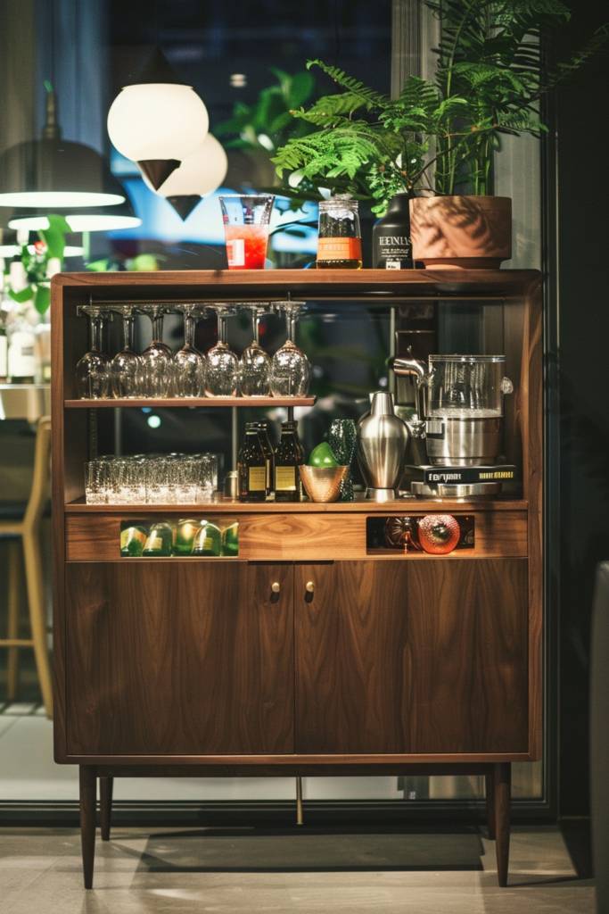 Start by removing the top drawers for an open shelf look, allowing easy access to bottles and mixers. You can paint or stain the sideboard to match your decor, giving it a personalized flair. Don’t forget to add stylish serving trays or baskets to keep everything organized and visually appealing.