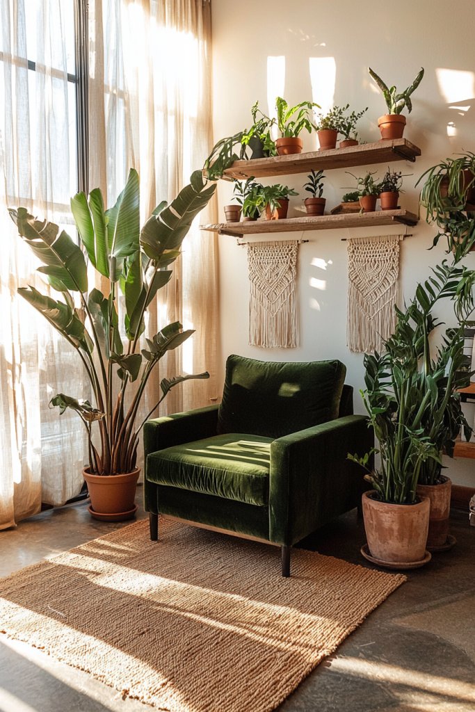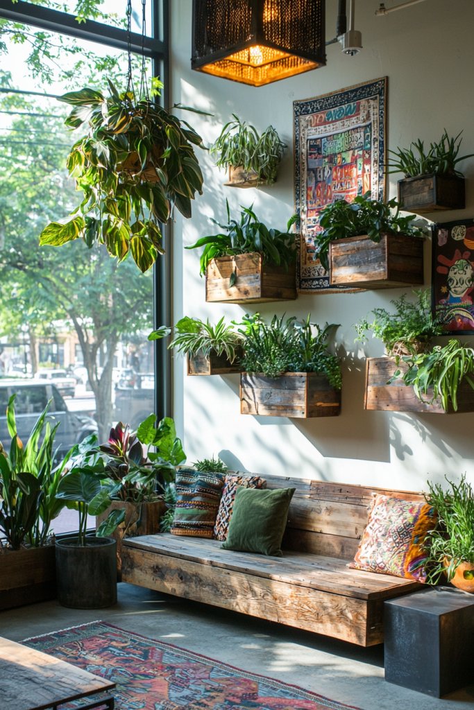 Use terrariums or macramé hangers for a touch of boho flair. Incorporate natural materials like wooden planters or stone pots to enhance the earthy vibe.