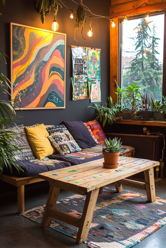 You can also mix and match materials. Old wooden pallets can become a rustic coffee table, while mismatched chairs can be painted in bold colors for a cozy dining nook.