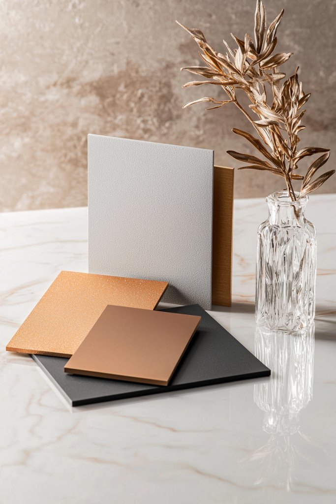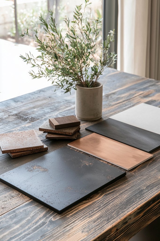 You can elevate your mood board with a mix of metallic elements, from radiant brass fixtures to chic chrome furniture. Consider layering these metallics against rich textures like velvet or deep woods.