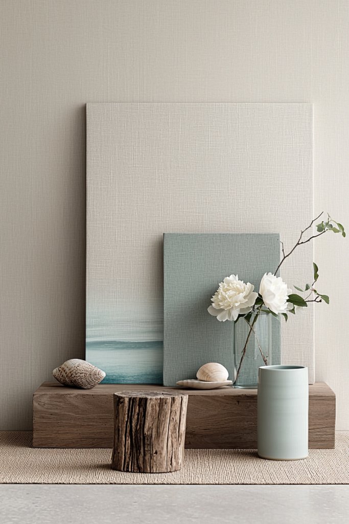 In this mood board, think about airy sheer curtains blowing in the breeze, paired with plush white sofas that invite relaxation. Accessories like marine-inspired artwork and nautical decor can subtly connect you to the ocean’s beauty.