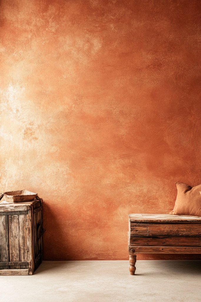 Imagine a wall painted in rich terracotta, textured with rustic plaster or subtle stucco. The warm hue envelopes the room, reflecting soft sunlight and creating a cozy glow. Complement it with distressed wood furniture and vintage accents to evoke a timeless Italian charm. The textured finish adds depth, making the space feel layered and inviting, like a Mediterranean retreat.
