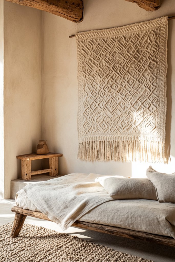 11. Neutral-toned Textured Wall Hangings or Tapestries