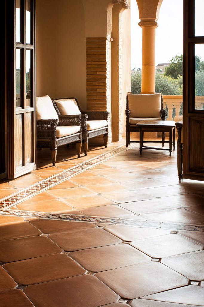 Imagine warm, earthy terracotta tiles laid out in a classic pattern, with decorative border tiles framing the space. The natural matte finish adds texture and depth, while the warm hues create a cozy, inviting atmosphere. The patterned borders add a finishing touch, reminiscent of historic Italian courtyards or village homes. The overall effect is rustic yet refined, grounding the room in Mediterranean tradition.